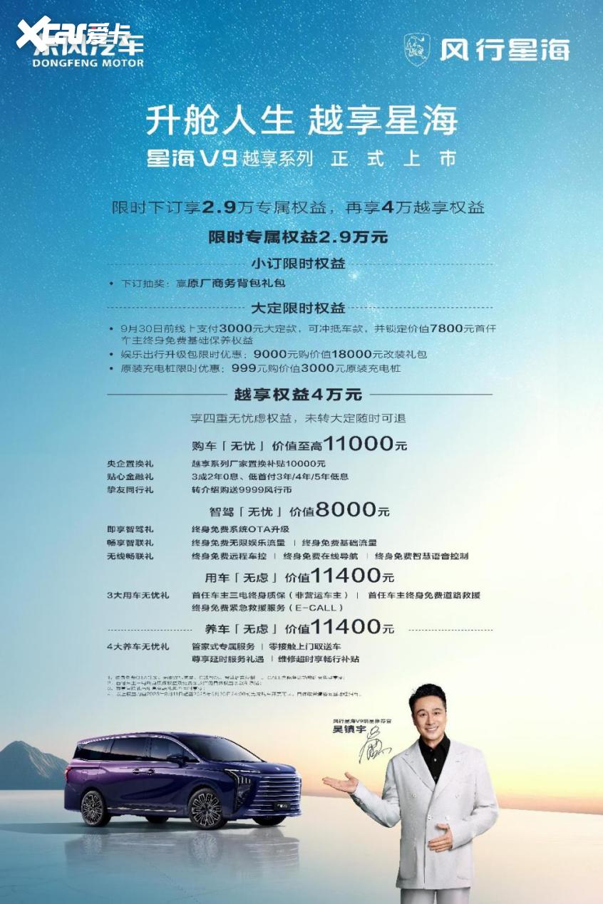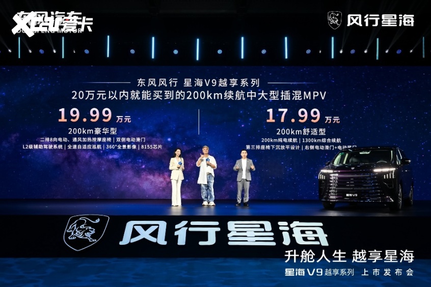 2025年8月21日,20万内唯一中大型插混MPV东风风行星海V9越享系列正式上市。新车共分舒适型/豪华型两个版型,官方指导价分别为17.99/19.99万元,国补央补后低至14.99/16.99万元起。凭借续航、空间、舒适、安全、品质五大升舱,东风风行星海V9越享系列以燃油车的价格,为用户带来高端新能源车的豪华体验,标志着“20万内新能源豪华MPV时代”正式到来。