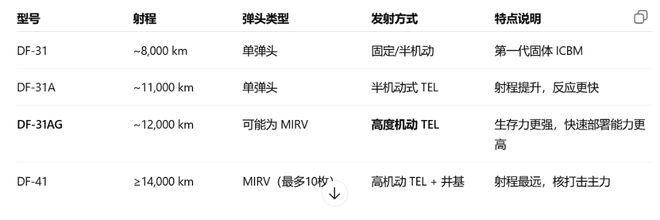 参考前面的表列,从DF-31AG开始是多弹头,核潜艇发射的巨浪-3也是多弹头。此外还有东风-5B、东风-5C液态燃料多弹头核导弹。