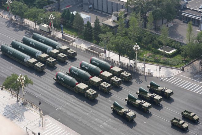以战略武力而言,这次九三阅兵展示了东风-61、东风-31BJ、东风-5C,(潜射)巨浪-3等洲际导弹,还有“空基”远程导弹惊雷-1,充分展现了中国的战略核打击能力。