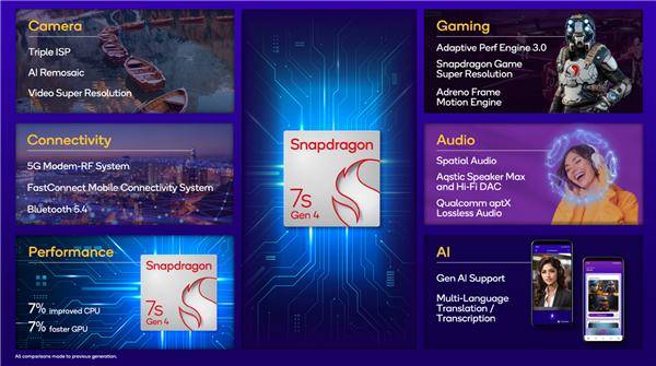 与前代相比,第四代骁龙7s的CPU性能提升7%、GPU图形渲染速度提升7%,可以看作是第三代骁龙7s的超频版。